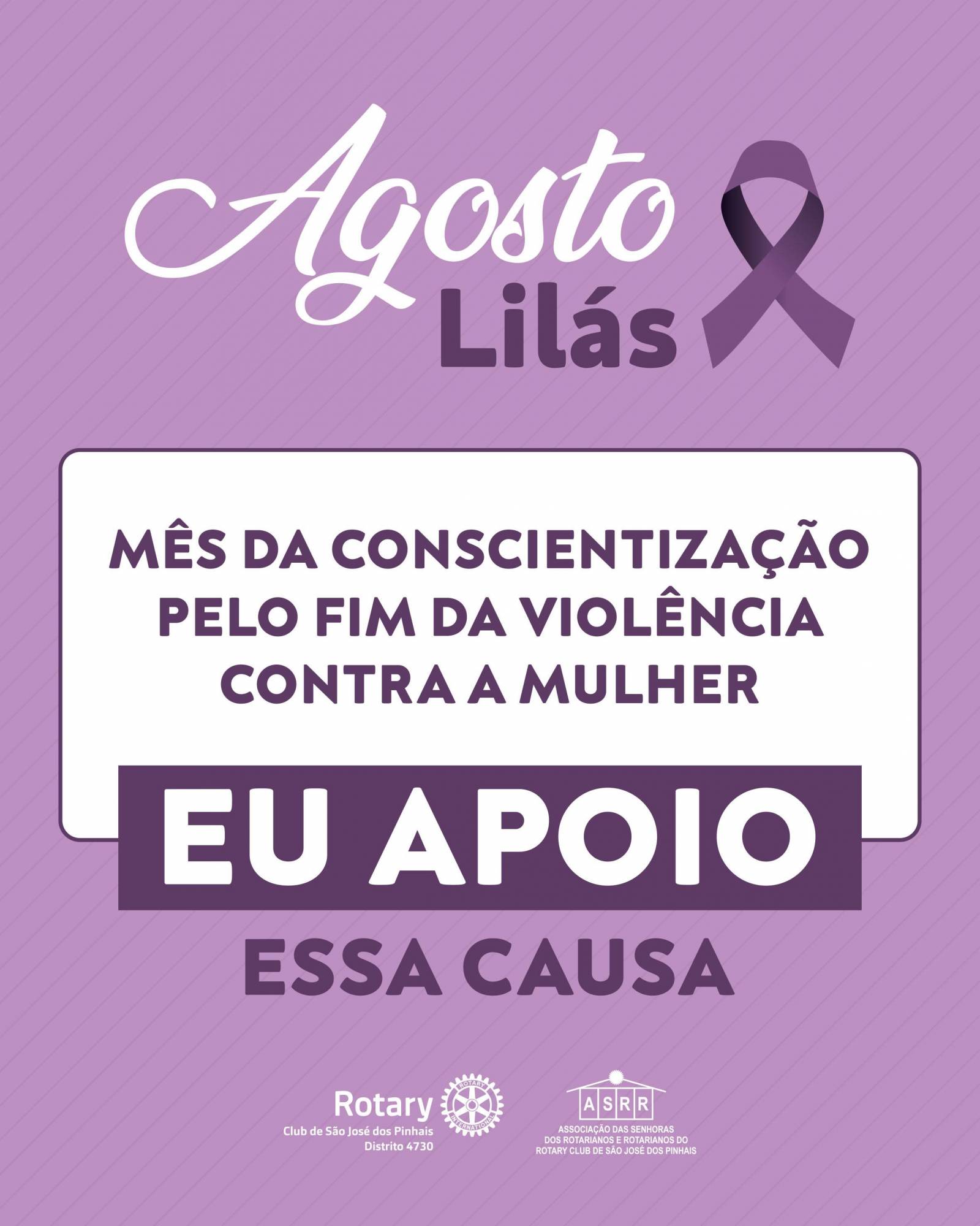 O Rotary Club São José dos Pinhais e a Associação das Senhoras de Rotarianos e Rotarianos (ASRR) aderiram à campanha Agosto Lilás, que atua pela conscientização da comunidade pelo alto índice de violência doméstica e familiar contra a mulher.