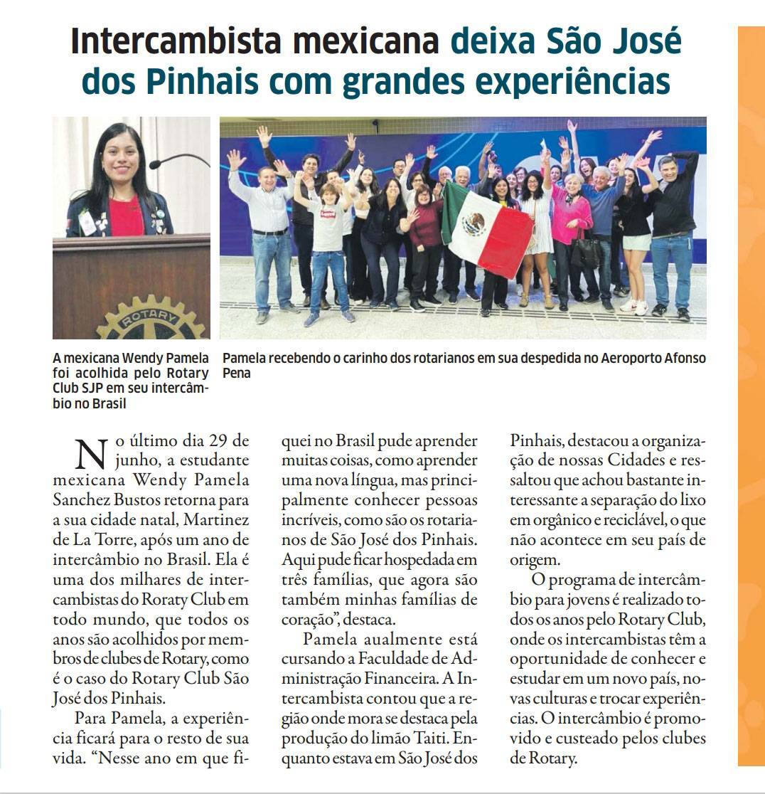 Na matéria, Pamela retorna para a sua cidade no México após um ano de intercâmbio em São José dos Pinhais, por meio do Rotary Club São José dos Pinhais, que se habilitou no programa de intercâmbio de jovens realizado todos os anos pelo Rotary Internacional e pelo Distrito 4730.