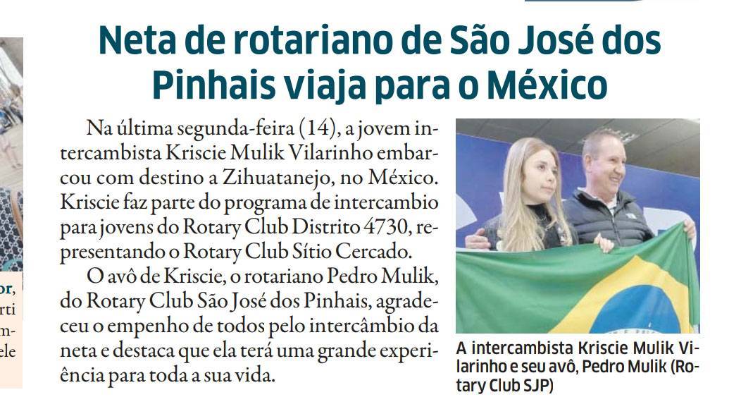 Na última segunda-feira (14), a jovem intercambista Kriscie Mulik Vilarinho embarcou com destino a Zihuatanejo, no México. Kriscie faz parte do programa de intercambio para jovens do Rotary Club Distrito 4730, representando o Rotary Club Sítio Cercado.