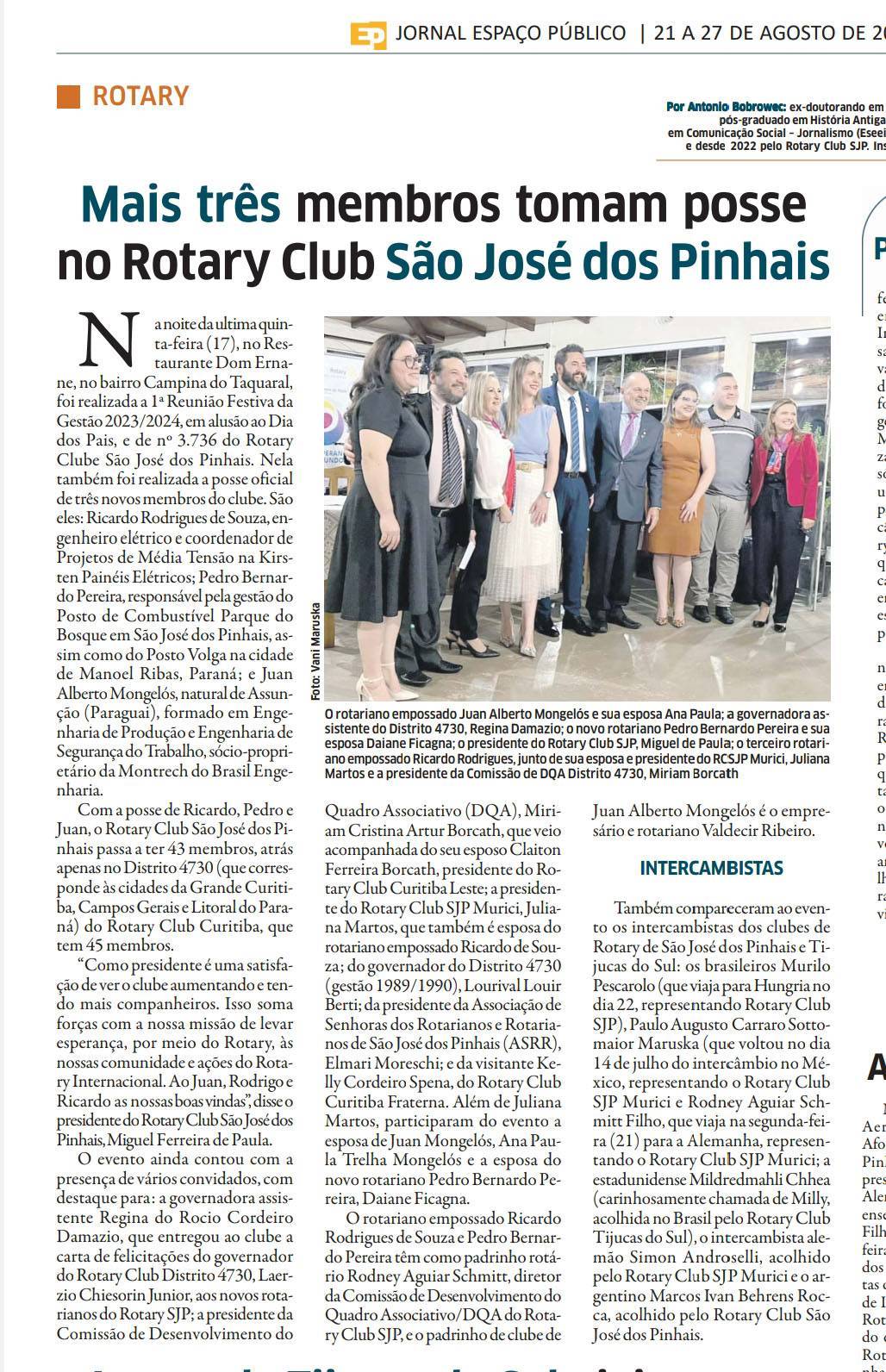 Jornal destaca a posse de três novos membros no Rotary Club São José dos Pinhais