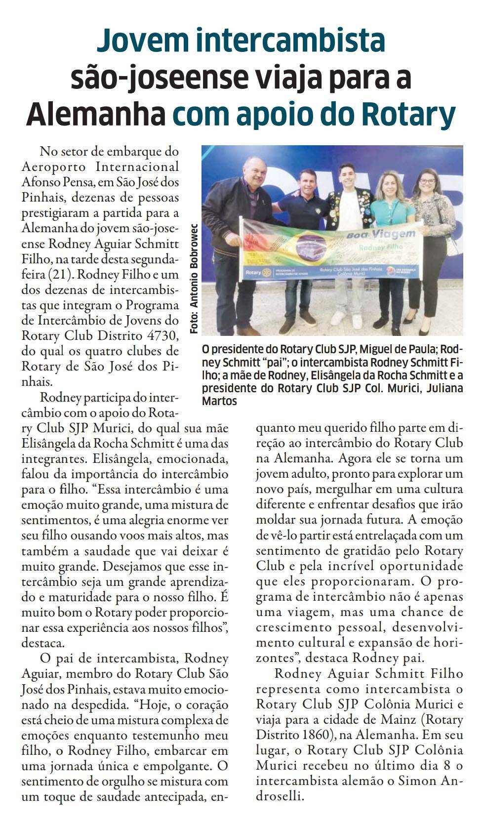 Saiu na edição 132, de 21 a 27 de agosto de 2023 do jornal Espaço Público, a notícia da partida para a Alemanha do jovem são-joseense Rodney Aguiar Schmitt Filho. Rodney Filho é um dos dezenas de intercambistas que integram o Programa de Intercâmbio de Jovens do Rotary Club Distrito 4730, do qual faz parte os quatro clubes de Rotary de São José dos Pinhais.