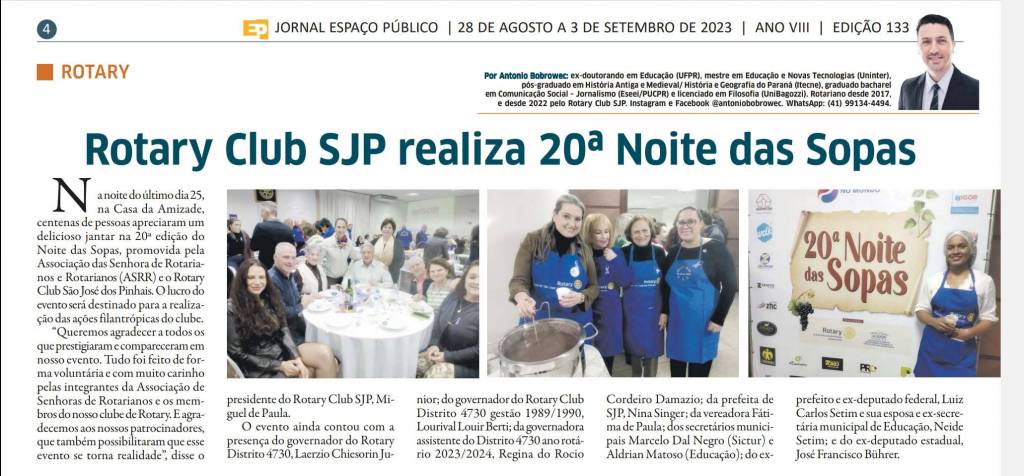 Na noite do último dia 25, na Casa da Amizade, centenas de pessoas apreciaram um delicioso jantar na 20ª edição do Noite das Sopas, promovida pela Associação das Senhora de Rotarianos e Rotarianos (ASRR) e o Rotary Club São José dos Pinhais. O lucro do evento será destinado para a realização das ações filantrópicas do clube.