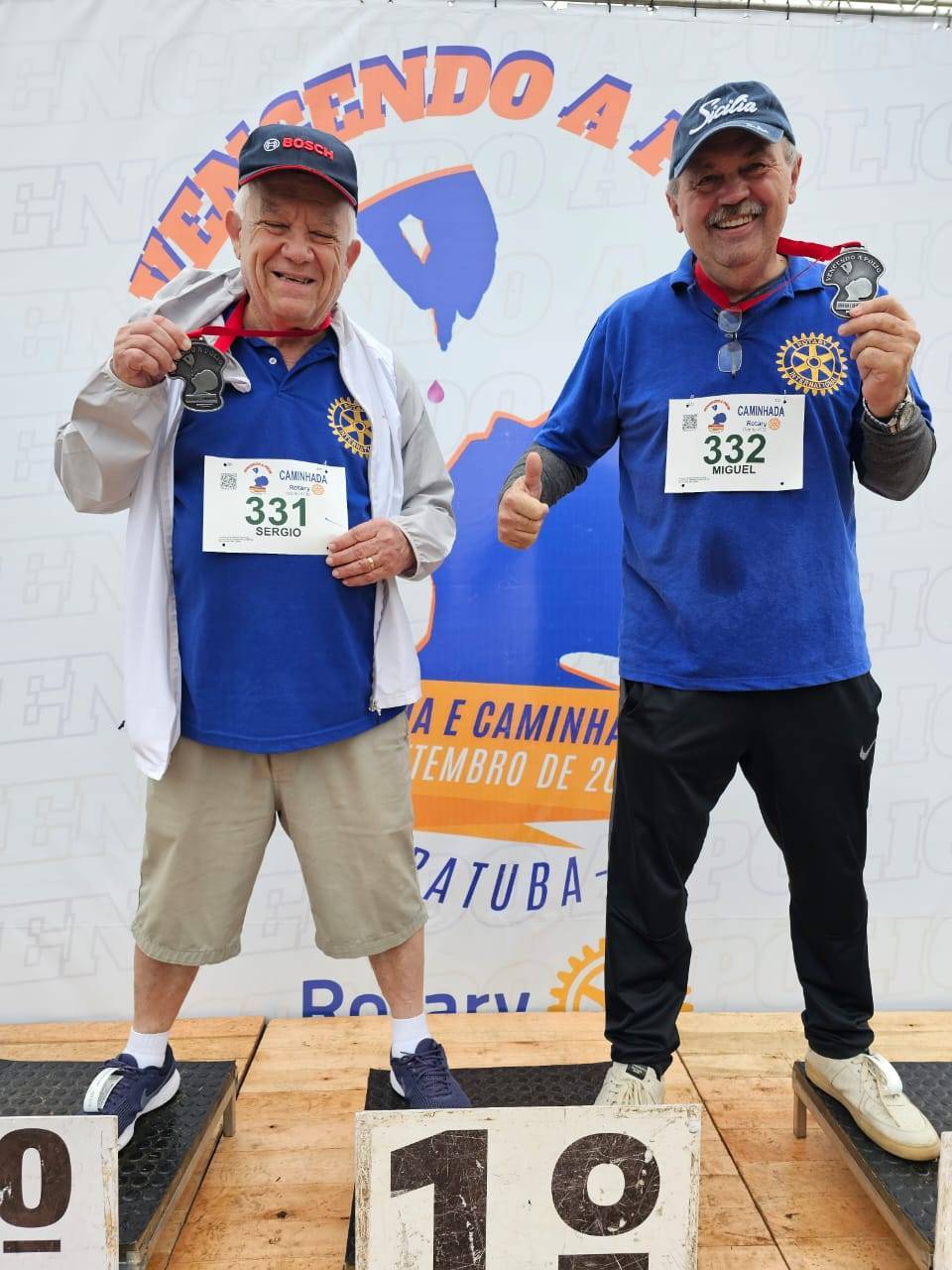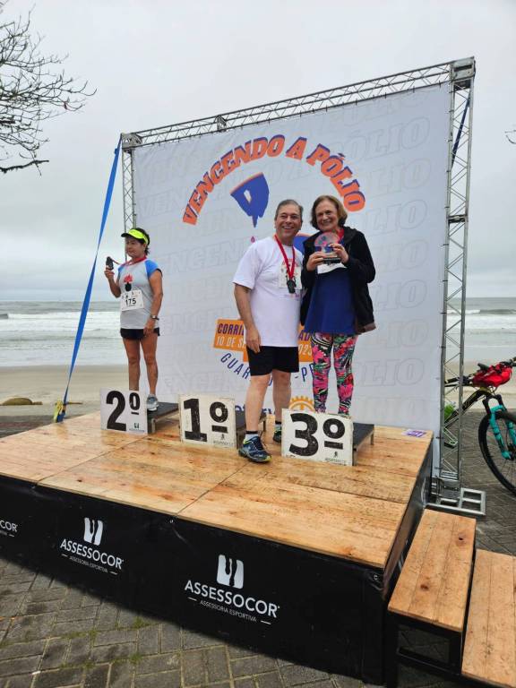 Importante: a presença dos nossos rotarianos em imagens no pódio foi meramente ilustrativa, em clima descontraído. A exceção de Elmari Moreschi, que realmente alcançou o 3º lugar na corrida de 5 km categoria acima de 60 anos.