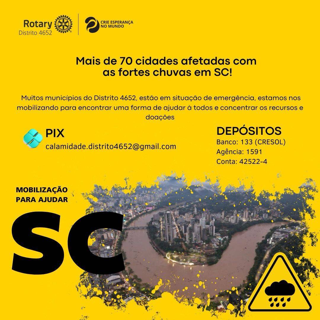 A grande quantidade de chuvas em acentuado a quantidade de locais alagados e de populações afetadas, como é o caso de Santa Catarina. Dessa forma, o Rotary Club Distrito 4652 está realizando uma campanha de arrecadação e auxílios para essas famílias. Segue post com mais detalhes para quem deseja colaborar.