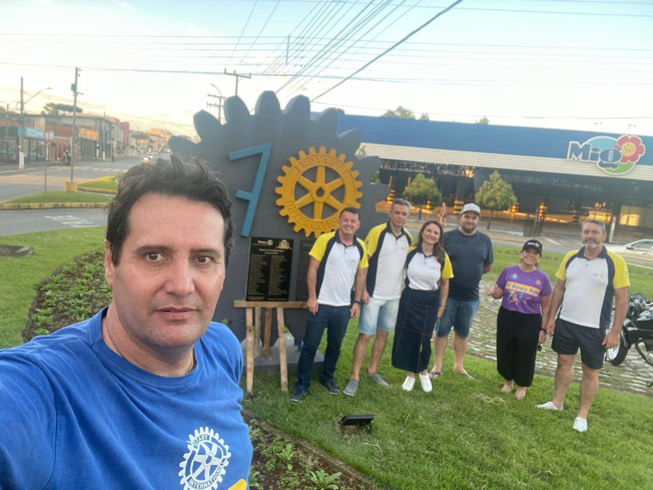 Companheiros e companheiras fixaram no marco rotário a placa alusiva aos 70 anos do Rotary Club de Rio Negro.