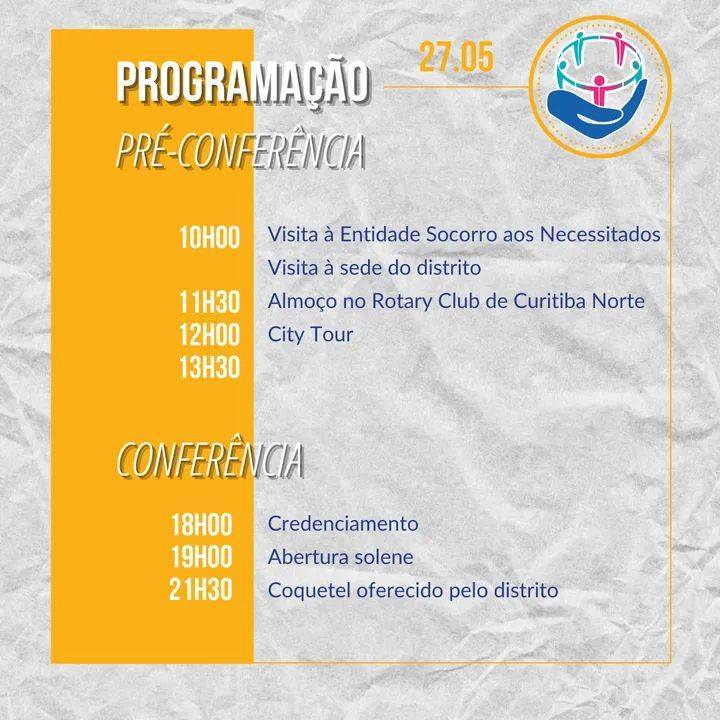 Promovendo o companheirismo e a confraternização entre os associados, a XXXVII Conferência do Distrito 4730 será realizada nos dias 27 e 28 de maio, no Centro de Eventos da FIEP. A programação completa do evento foi divulgada hoje (19) e inclui palestras, premiações, entre outras atividades.