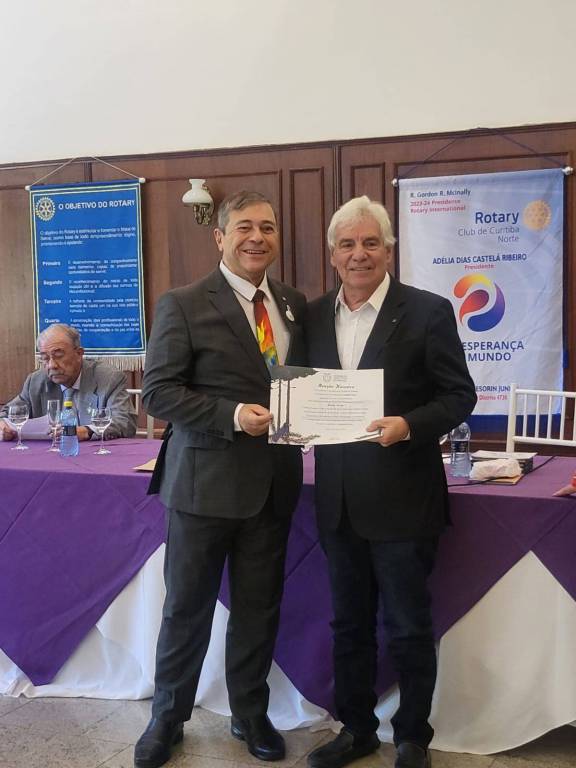 Em uma tarde repleta de gratidão e reconhecimento, o Rotary Club de Curitiba Norte realizou uma reunião especial com a presença do Governador 2023-24 Laerzio Chiesorin Junior e do Governador Eleito para o ano 2024-25 Alfredo Arten Júnior, para a entrega dos certificados de Honra ao Mérito, concedidos pela Assembleia Legislativa do Estado do Paraná, ALEP, por ocasião do Dia do Rotariano comemorado em 27 de abril.