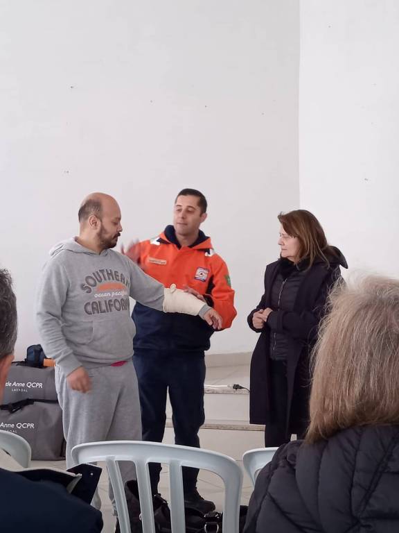Todos foram convidados a aprender a abordagem primária à vítima de trauma, verificação de grandes hemorragias, transporte e RCP, reanimação Cardiopulmonar; uso do desfibrilador.