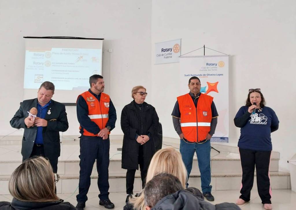 No último sábado dia 10, os clubes se reuniram na sede do Rotary Club de Curitiba Avenida das Torres, mais conhecida por ARCA, para participar do 2º Treinamento do Projeto PAM Rotary, Programa de Auxílio Mútuo. Trata-se de uma parceria entre o Rotary Club de Curitiba Avenida das Torres e a Defesa Civil de Curitiba com apoio do Distrito 4730 de Rotary International. O treinamento contou com a presença do Governador da gestão 2024-25, Alfredo Arten Junior, e sua esposa, Karina Cantarelli Arten, e de rotarianos de vários clubes prestigiando o encontro.