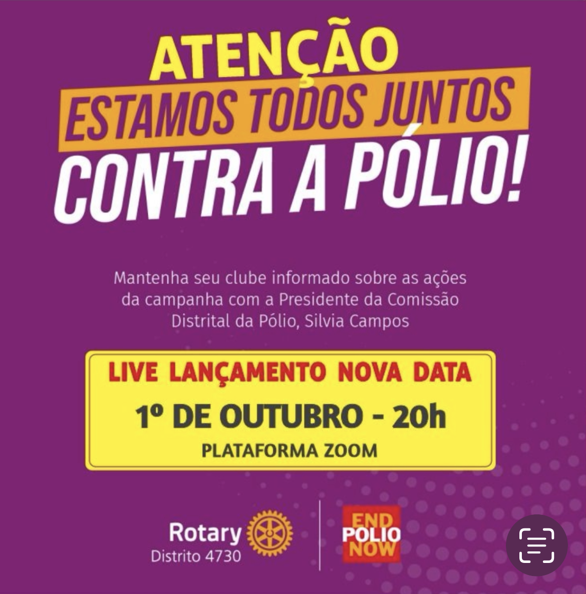 Na data de 01/10/24 (terça-feira as 20:00horas) o Companheiro Diogo Cordeiro, representou o Rotary Club de Curitiba Guabirotuba na LIVE - “ESTAMOS TODOS JUNTOS CONTRA A PÓLIO!” - Coordenada pela Governadora (EGD) Silvia Maria de Campos, presidente da Comissão Distrital da Pólio.