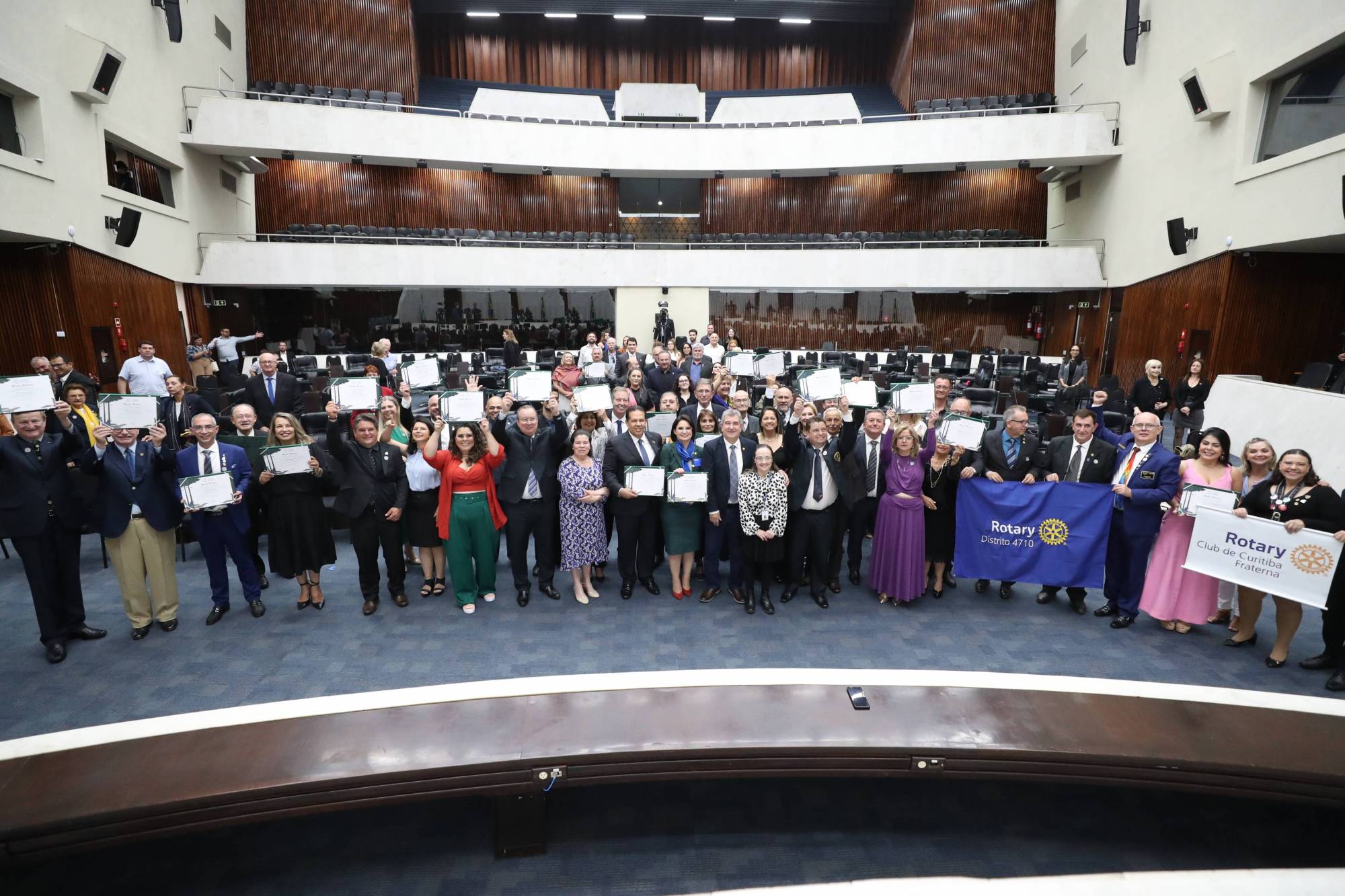 Na noite de ontem, 16/10, a Revista Rotary Brasil foi homenageada em uma sessão solene realizada no Plenário da Assembleia Legislativa do Paraná. O evento celebrou os 100 anos de atuação da Revista Rotary Brasil. O evento foi uma proposição do deputado Pedro Paulo Bazana, PSD, em reconhecimento ao centenário do veículo de comunicação do Rotary International para os rotarianos brasileiros, que informa, une e inspira sobre o trabalho humanitário da organização. Ainda sob organização e escolha do deputado Pedro Paulo Bazana, como forma de agradecimento às lideranças rotarianas do estado do Paraná, foram entregues diplomas com Menção Honrosa com os seguintes dizeres: “A Assembleia Legislativa do Estado do Paraná, por proposição do deputado estadual Pedro Paulo Bazana, concede votos de congratulações em reconhecimento pelos esforços e contribuições ao centenário da Revista Rotary Brasil”.