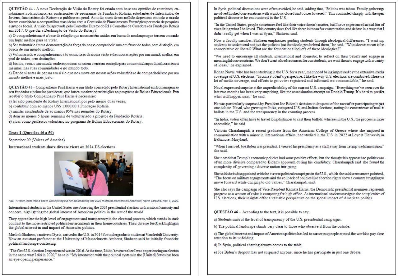 O Governador do Distrito 4730 de Rotary International, do ano rotário 2024-25, Alfredo Arten Junior, no uso de suas atribuições legais, regimentais e estatutárias, juntamente com a Presidente da Comissão Distrital de Serviços à Juventude, Solange Busnardo Mattiello, a Subcomissão Distrital do Programa de Intercâmbio de Jovens representada por seu Chairperson, Marcelo Adriano Martynetz, tornam público o Caderno de Prova e o Gabarito da prova do processo seletivo do Programa de Intercâmbio de Jovens de Longa Duração.