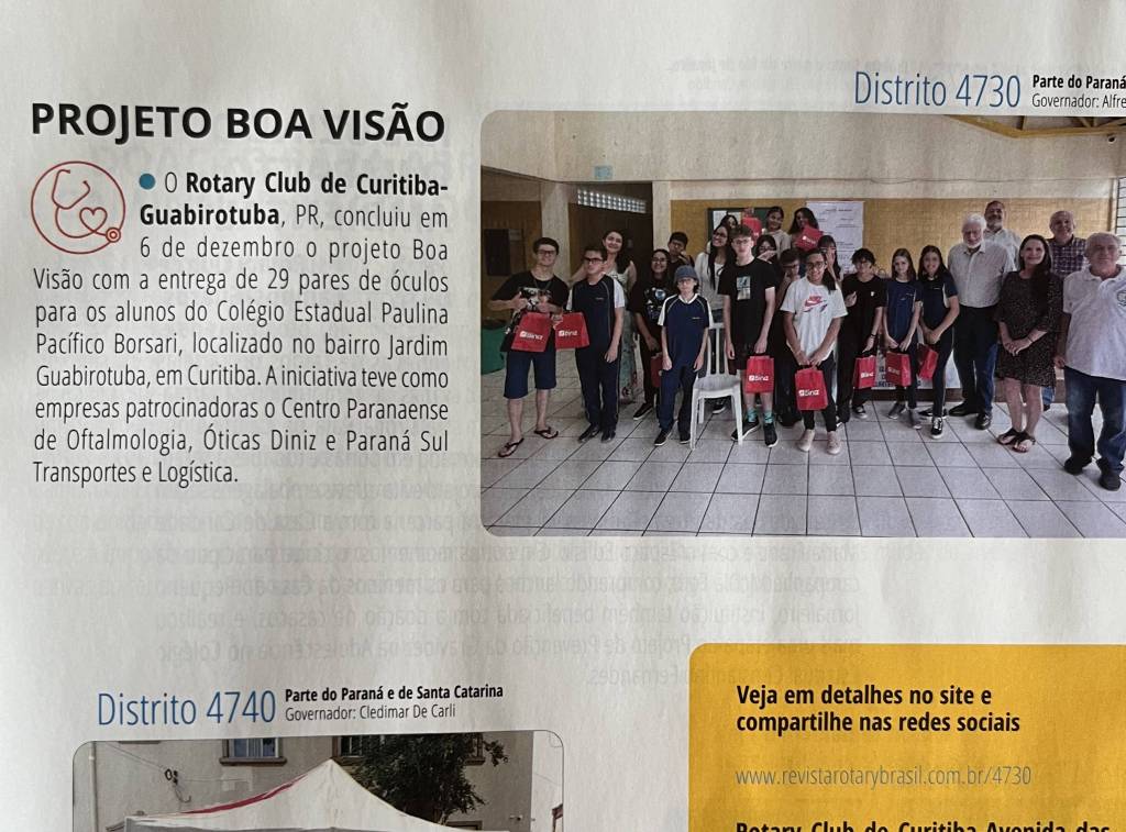 Na edição de n.º 1233 de março de 2025 da Revista Rotary Brasil foi publicada na seção Rotary em Ação – Clubes e Distritos – DISTRITO 4730 Governado Alfredo Arten Junior (pág.61) a matéria do Rotary Club de Curitiba Guabirotuba relacionada ao Projeto BOA VISÃO concluído em 06 de dezembro de 2024 em escola pública no território de atuação do Clube.