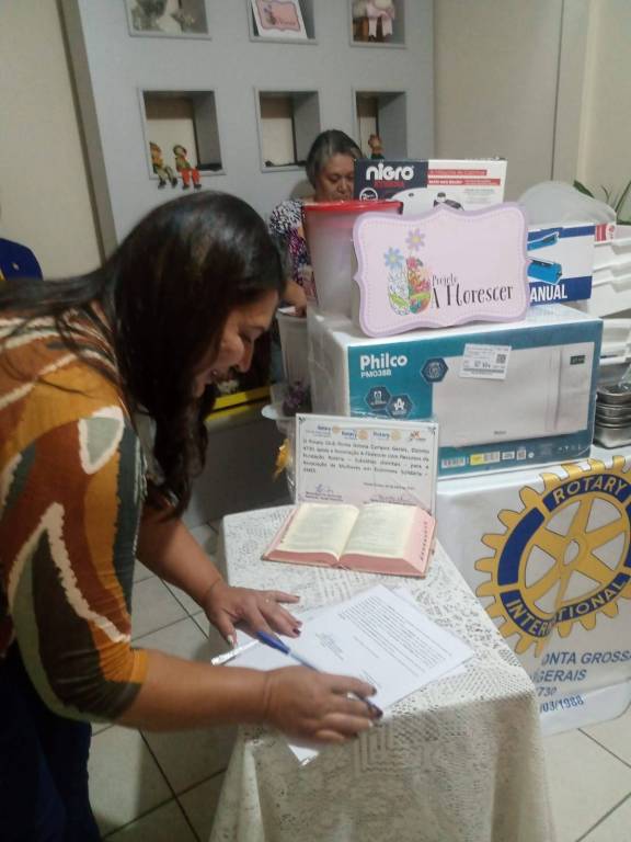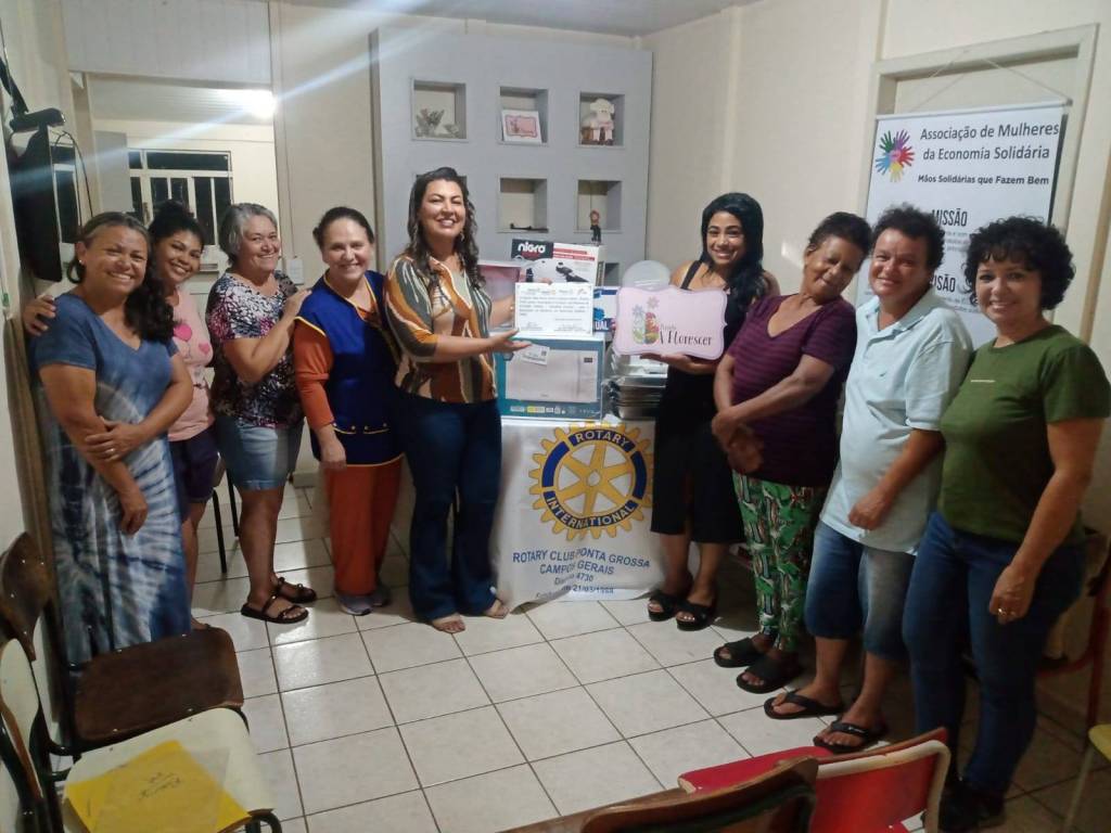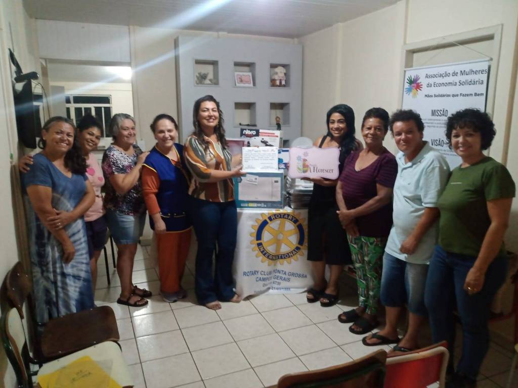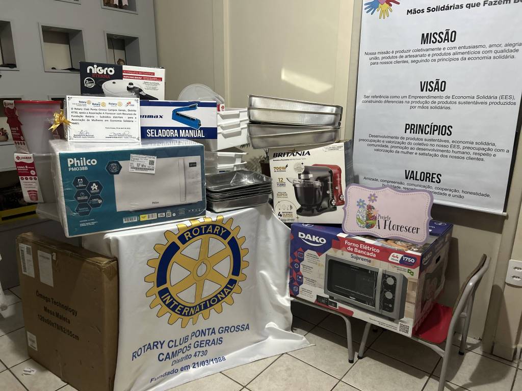 Assim, no dia 03 de abril, a presidente do RC Ponta Grossa Campos Gerais, Rosemare Gomes de Camargo em conjunto com a diretora de Fundação Rotária, Maria Luzia Fernandes Bertholino dos Santos, a diretora de projetos Humanitários Cleonice de Fátima Martins, a presidente do A Florescer Adriana Alves dos Anjos entregaram 1 forno elétrico , 1 micro-ondas, 1 mesa maleta dobrável portátil, 1 batedeira planetária , 2 espátulas pão duro de silicone, 6 kits 2x forma assadeira alta Aco Inox, 6 bandejas topa tudo 11,5 L, 1 seladora manual para sacos plásticos, 4 assadeiras de alumínio alta lisa , 2 conjunto mantimento 5PCs redondo, 4 caixas 4 L, 1 caixa goumer 17 L, 2 caixas 15 L juta com tampa, 3 conjuntos mantimento 6PC Redondo , 3 forminhas viel ondulada 5cm cartela c12 e 1 panela de pressão 4,5lts.