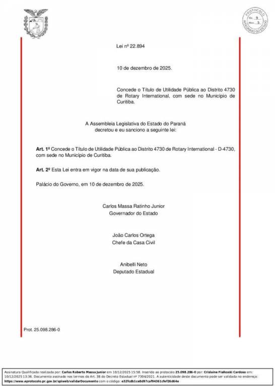 O Distrito 4730 de Rotary International sob a liderança do Governador Marcelo Augusto Passos (2025-2026) e que congrega os oitenta clubes rotários da Capital, da Região Metropolitana de Curitiba (RMC), Litoral, Sudeste e da região dos Campos Gerais, foi oficialmente reconhecido como sendo de Utilidade Pública Estadual.