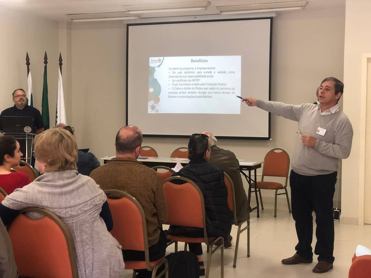 O presidente da Comissão Distrital de Fundação Rotária, Laerzio Chiesorin Junior, e o coordenador da sub-comissão da ABTRF, Julio Germano, explanaram sobre o funcionamento do programa e dos benefícios que a empresas obtém ao aderirem. Entre eles, está a divulgação da marca da empresa nos eventos e na comunicação dos clubes e do Distrito, além da possibilidade de indicar uma pessoa para receber um Título Paul Harris, quando a doação alcançar a marca de mil dólares rotários.