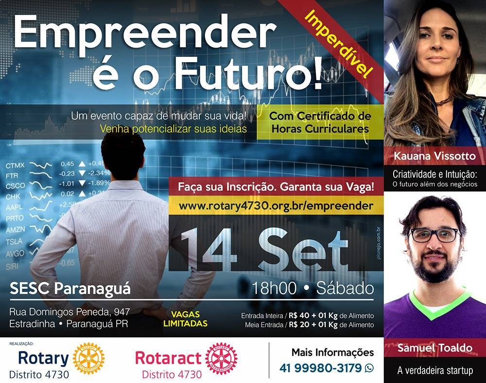 Paranaguá será palco do evento “Empreender é o Futuro”, que será realizado no dia 14 de setembro, sábado, às 18h00, no SESC de Paranaguá. O objetivo do encontro é trazer empreendedores de sucesso, para compartilharem suas histórias e dicas sobre como começar e administrar os próprios nos negócios.