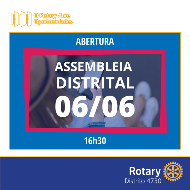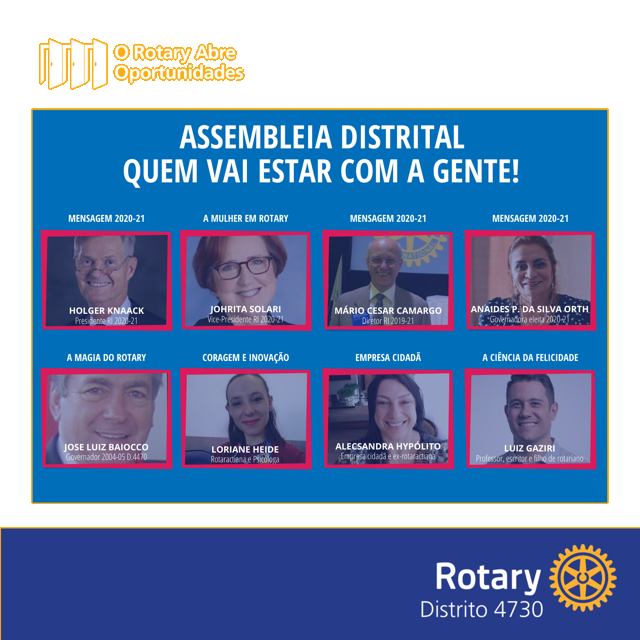 Em um formato inédito, a XXXVI Assembleia Distrital de Treinamento começa suas atividades na próxima semana (06/06). A cerimônia de abertura será realizada ao vivo, a partir das 16:30 horas, pelo canal do Distrito 4730 no Youtube (youtube.com/watch?v=ZQeD21n7Gvc). A programação do evento conta com diversas surpresas e depoimentos inspiradores de rotarianos, além de presenças especiais — como o Presidente do Rotary International 2020-21, Holger Knaack, e a Vice-Presidente do Rotary International 2020-21, Johrita Solari.