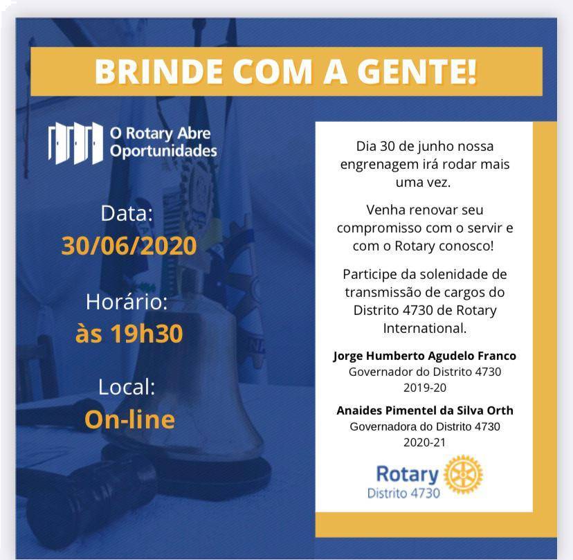 Assim como uma série de eventos online inéditos para o Distrito 4730, a transmissão de cargos virtual foi idealizada para atender as medidas de distanciamento social. “A posse será diferente dos outros anos, mas nem por isso vamos deixar de celebrar. Vamos comemorar esse momento, cada um em sua casa, mas juntos, conectados”, reforça Jorge Franco, Governador Distrital na gestão 2019-20.